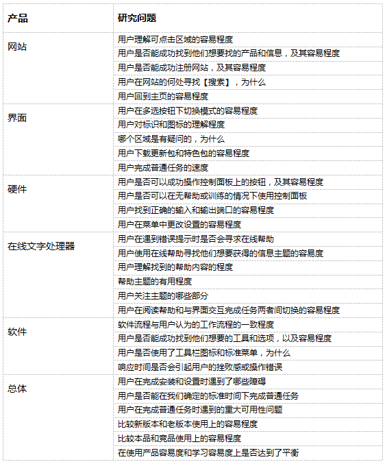 下表列出了几类不同产品的研究问题,这些案例的研究问题恰当,重点明确。研究问题是在和开发团队或开发人员、技术人员、市场人员的讨论中形成的。如果他们很难归纳出测试目标或者仅仅提出了大概的问题或目标,也无需沮丧,这可能正说明:
