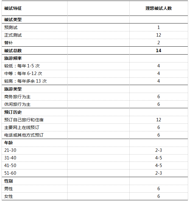 测试计划的这个部分是描述测试产品的终端用户特征。与组织内的其他成员通力合作,从而确定目标用户的特点是非常重要的。有关如何建立用户档案和招募被试的具体过程可参见第7章。图5-3举例某在线酒店预订网站可用性测试中的被试特征。