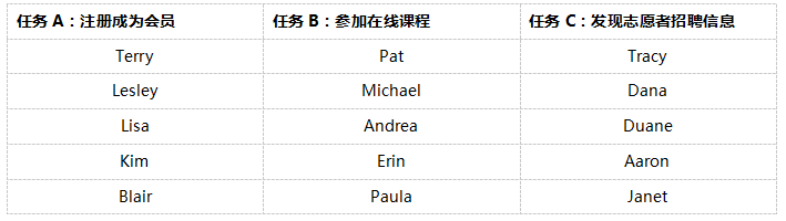 顾名思义,独立组间设计是指网站的每一部分都是由不同的用户测试的。如下表所示,组间设计要求15名被试,每名被试仅完成一个任务。这样会消除任务的先后顺序造成的潜在的学习迁移效应。用户完成任务A可能会帮助他们顺利完成任务B,因此与任务B有关的可用性问题很难被发现。另外,如果每个任务都非常长,被试有可能疲惫,你也应该使用这种设计。