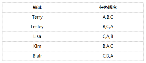 为了平衡抵消,如下图所示,你需要改变任务的顺序,每名被试完成任务的顺序是不同的。任务顺序随机化减弱了迁移效应,在上述例子中你最少只要4名被试就够了。但是,随机化顺序会引起其他问题。在日常生活中很多流程本身就是有顺序的(譬如注册后才能进行付款),如此一来你就不得不做出权衡:到底是让用户按照正常顺序完成任务,但有可能掩盖后续任务的可用性问题(可以测量被试在任务过程中是否有学习效应)呢?还是提供随机顺序的任务(一般是在实验室中),但被试有可能迷惑和陌生?大多数人同意你应该保持合理的任务顺序。如果你决定这样做的话,你需要注意可能的迁移效应。你可以在正式任务前,让被试预先进行训练,使被试间的使用经验达到相同水平。另外,在进行完每个部分后被试要有间隔时间休息。