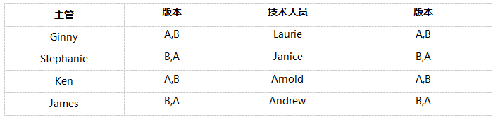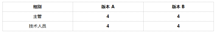 现在让我们来看另外一种常规情况。譬如你想要比较某个产品的2个不同版本,版本A和版本B,以便确定最终设计采用哪个版本更好。同时,你想要比较两类用户组,主管和技术人员,使用产品的差别。这就相当于2×2的矩阵设计。