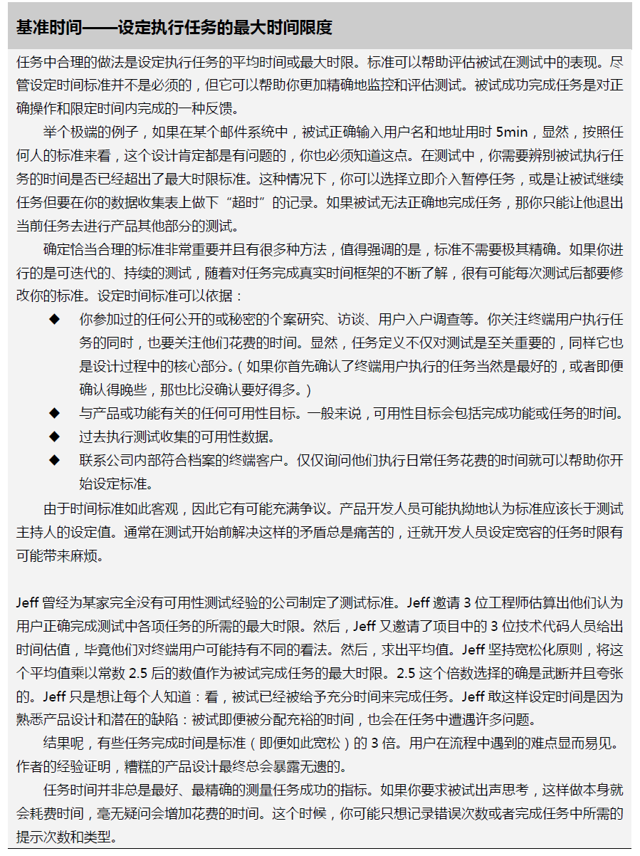 你可能想用时间作为衡量任务成功的标准或是基准。如果你基于时间设置某些基准,那我建议你务必考虑周全,且将此限定在合适的情况下。限定时间的任务在验证/总结性测试中的确是很好的测量方式,但在早期的探索性测试中通常不适用。另外,如果你在测试中要求被试出声思考,那我也不建议你限定时间标准,显然出声会影响任务时间。除了时间外,你还可以用错误率作为基准:例如,无错误一次完成的任务的频率。