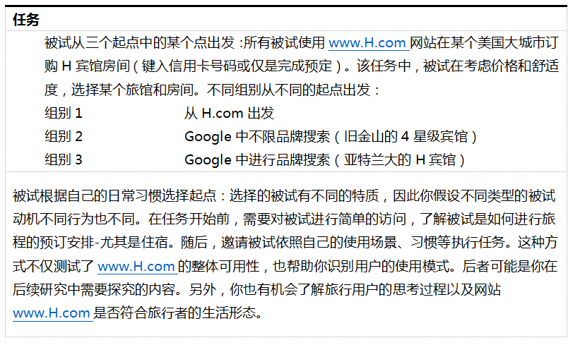然后,才是将任务扩展为丰富的任务场景脚本,供被试使用。场景脚本应该有现实细节和情境,帮助被试无需主持人的介入就能进行。