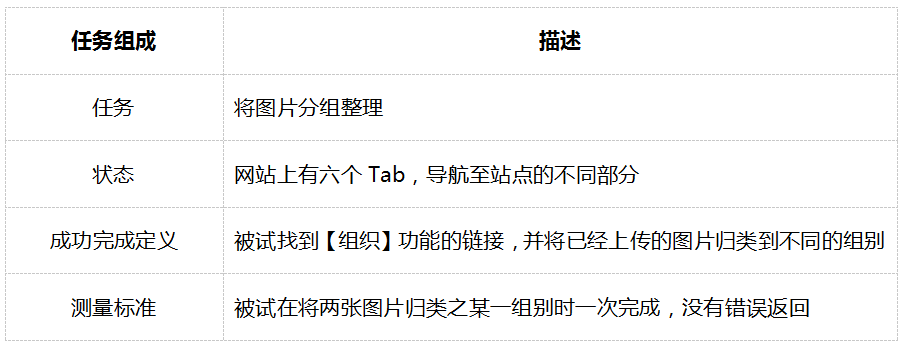 假设你的目标之一:是测试某个供业余和专业摄影师使用的图片分享网站中的Tab标签是否易于理解。将这个测试目标书面化:“了解用户是否可以理解XYZ标签的含义”。在网站上有6个文本Tabs。其中,XYZ标签是有问题的,其标签文本为“Organize(组织)”。