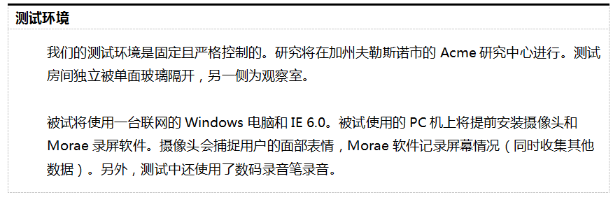 测试计划的这部分会阐明:你试图在测试中营造的环境和被试需要使用的设备。例如,你想模拟某个保险员的产品销售办事处环境。或者你的产品被化学家用于环境实验室中。又或者你想在嘈杂、拥挤、电话时常响起的环境中测试你的产品。测试场景尽可能地向真实场景靠近。这会帮助被试感觉自己是个真实的终端使用者,而不是被测试者。而且,得到的结果更贴近真实场景下产品使用的情况。
