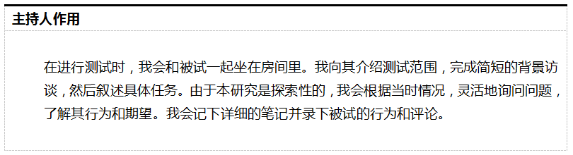 这章节解释你作为测试主持人要做什么。如果测试中充当观察者的同事对测试过程不熟悉时,写明主持人作用尤为重要(示例见图5-7)。你要明确主持人什么时候会有些不寻常的举动,以免引起困惑:譬如,主持人在什么情况下会发问或介入测试,以及介入的原因。尤其是在面对过分沉默的被试时,主持人可能会假定自己是某些角色或是魔鬼代言人,鼓励被试发言。