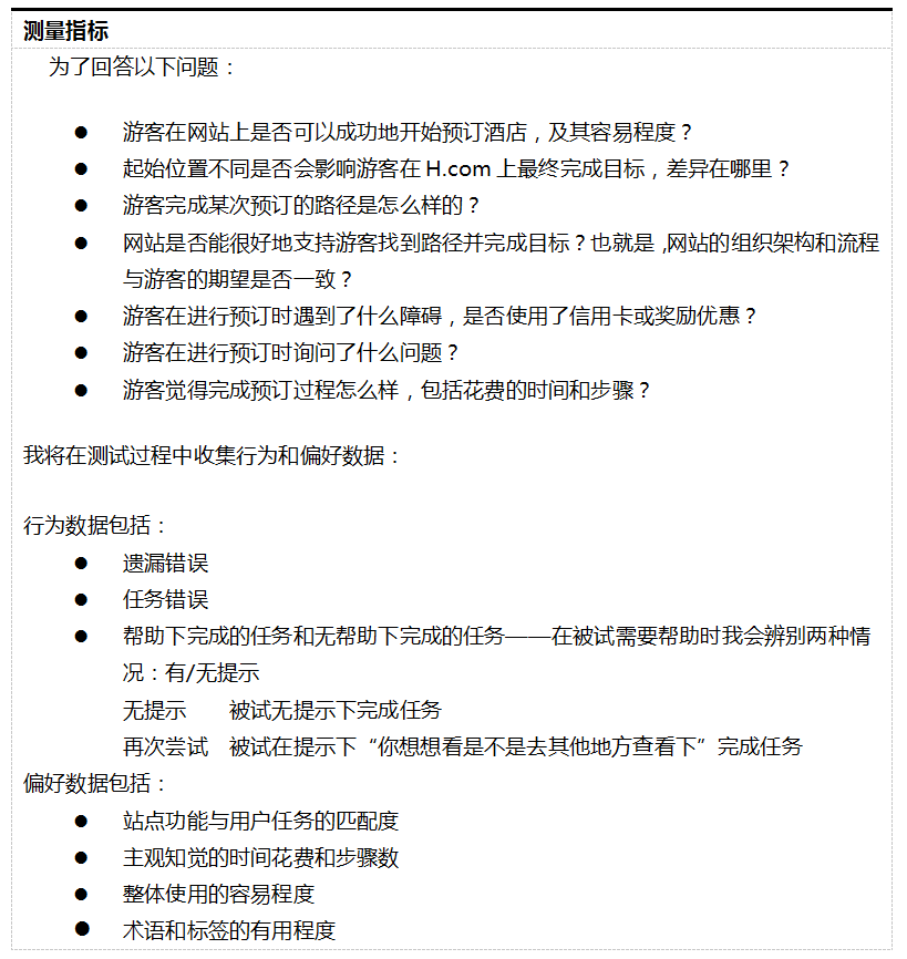 测试计划的这部分会说明测试中收集的数据类型:包括行为和偏好数据。行为数据是指测量被试行为的这部分结果,包括错误率、任务中寻求帮助的次数、执行任务花费时间等。偏好数据是指收集到的被试看法、思考过程的数据,包括被试排序结果、问题的回答等。收集哪些数据是由研究问题决定的。有时,测试计划中的其他部分,如测试方法中已经列出了一些数据指标。不管是定性还是定量地测量行为或是偏好数据,这一切都取决于测试目标。图5-8是在线酒店预订网站进行测试的数据示例。
