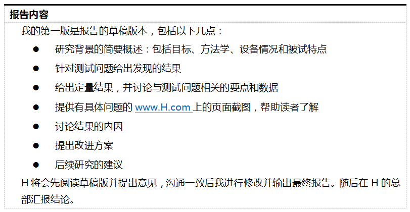 如果我们把上述提到的部分汇总起来,将会得到一份10页左右的测试计划。你可以访问本书的网页地址(www.wiley.com/go/usabilitytesting)参看完整计划案例。案例中我们测试了某个在线酒店预订系统,你可以下载相关的测试计划和其他文档。 |