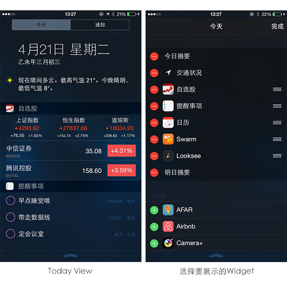 task in the Today view of Notification Center”(在通知中心的今日视图中快速获得更新或完成操作)——从此在许多场景下、用户毋须再前往桌面寻找icon进入app了,只需在屏幕上轻轻一Swipe(即使在未解锁状态下),就可以展开Today