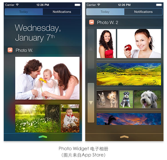 与之相似的还有电子相册Photo Widget,挑选若干手机相册中的照片放进Today View,下滑就能看看照片……虽然这个行为当前看起来没啥价值,但其中也能够想到不少深挖的需求与概念,大家可以自行想象哦。