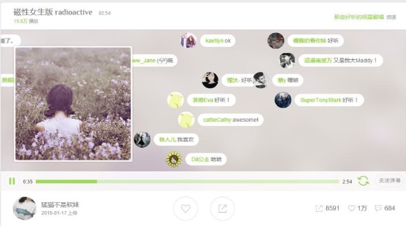 以上我们看到了聊天软件的触角正在向不同的领域延伸,而事实上,非聊天产品们也在做聊天的事情,而这种融合在广泛的生活场景中“聊天界面”又有了更多变幻空间。如现今视频播放界面中喜闻乐见的弹幕,它将聊天直接插入到视频画面之中,虽然融合的方式简单粗暴,却带来了意想不到的社交增强效果,在某些场景下带来了广泛的共鸣。在声音制作分享产品echo中,音乐播放界面甚至直接使用弹幕作为界面主体。对于一个缺乏视觉元素的产品,这是一个值得一试的做法,而对于一个UGC的社区,利用聊天拉动气氛更是情理之中。