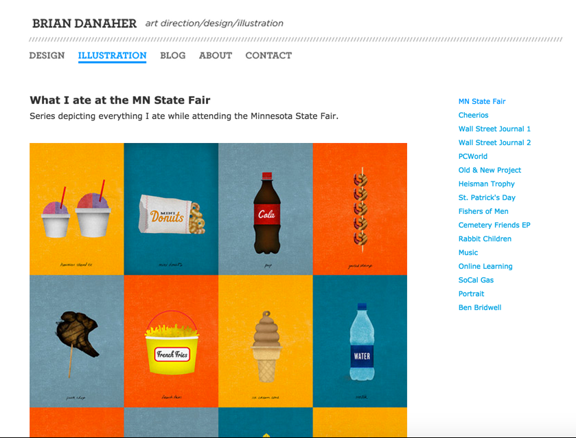 设计师Brian Danaher的个人网站,在15寸MacBook Pro上浏览时,留白占据了绝大部分空间;不同灰度的文字搭配一种关键色