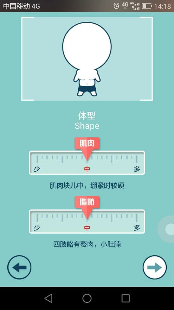 这类型的错误主要是在使用手机或平板的时候会遇到,比如前些天我遇到的一个健身类型的APP,里面有个设置体型的环节,界面如下: