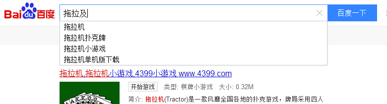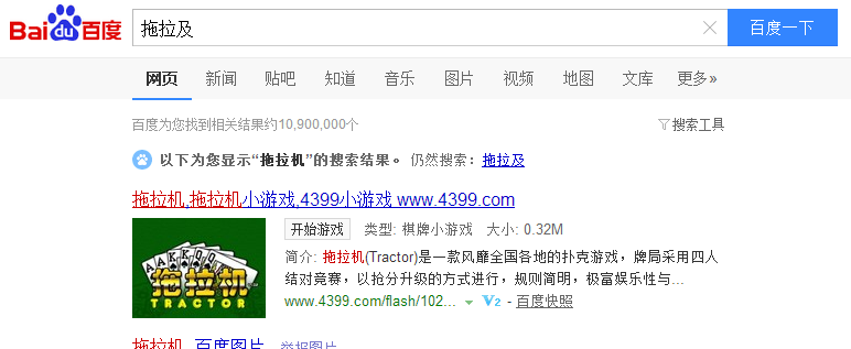 为什么这边不先提供搜索“拖拉及”的结果,然后在提供文案给出搜索“拖拉机”的链接呢?我想这边的原因在于,百度的搜索结果是根据热词和热度优先搜索的,这也符合一个搜索引擎的产品形态。所以说,产品设计也要跟产品形(ce)态(lie)相结合。