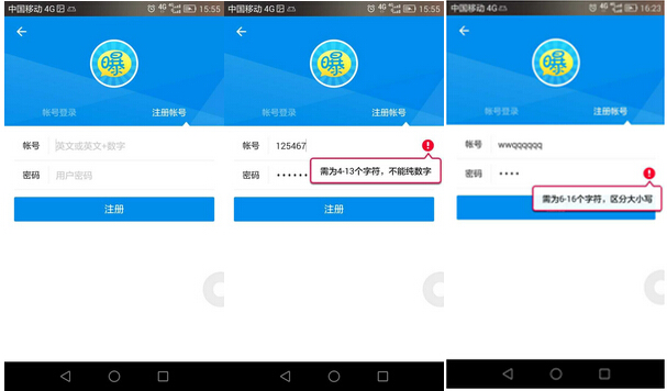 - 进入注册页面时,帐号输入框默认显示“4-13个字的英文或英文+数字组合”,密码输入框默认显示“6-16个字符,区分大小写”——提示规则要全面。