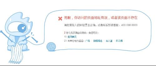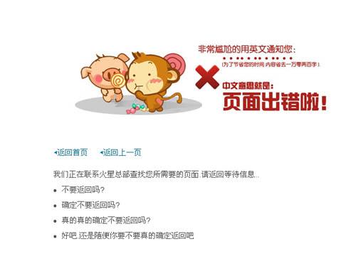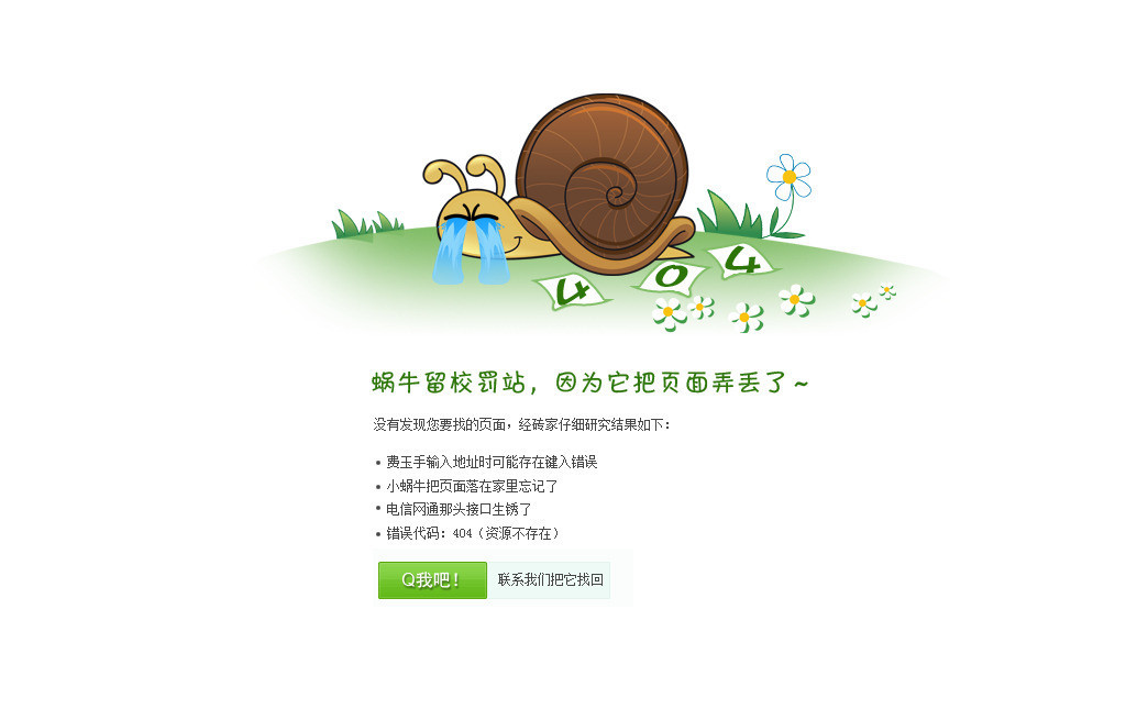 可爱吧~清新吧~正常情况下访问到404页面总是不会有什么好心情,但是看到这个完全没有这个感觉(即使有也被冲淡了),还会有种新奇的感觉,然后页面又提供了“Q我吧”的解决方案,简直帅呆了啊!不信看看以下几个虽然也很有趣的设计: