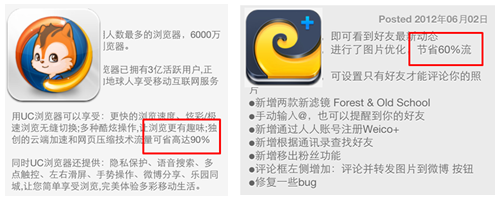 节省流量现在被很多产品拿来宣传,特别是手机浏览器和一些需要信息展示的应用。如UC浏览器就号称首创业界先进技术,使流量数据压缩率高达90%,用户上网速度更快,流量更省。你是不是因为这点心动了?所以在同质化的产品中,流量就是一个可以突出的卖点。