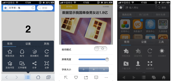 现在很多浏览器和阅读器,如ZAKER,QQ/UC浏览器等,都直接配置夜间模式,和屏幕亮度调节。让我们在弱对比度中,感受到产品对我们的体贴的一面。这些也都是考虑到移动产品场景的复杂性和变化。