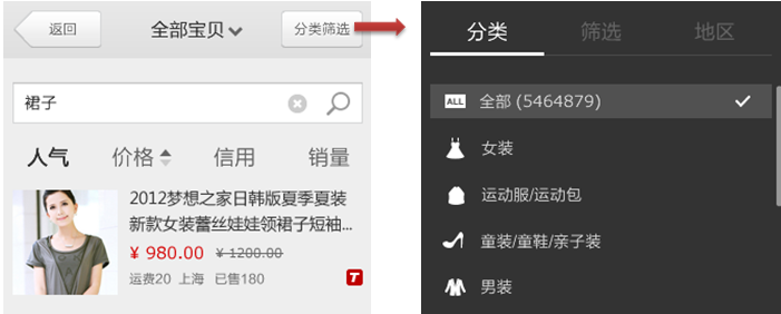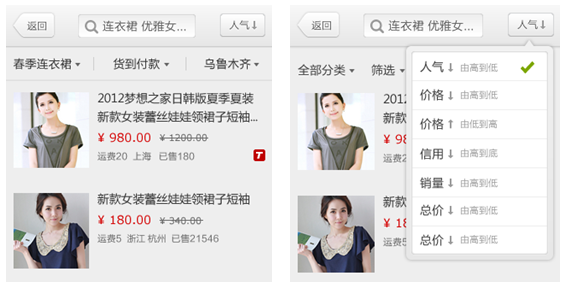 避免单任务窗体带来的劣势,可以从信息架构扁平化入手,也可以从减少切换,缩短路径的方式来实现。我们在电子商务移动领域,创新性的在搜索结果页中引入了详情内容,这样的方式让用户的交易成本降低了,产品体验和交易效率得到了极大的提升。设计上线后,搜索结果页进入详情页的点击数少了近10%,但最终的引导成交额和成交转化率保持平稳。这样的设计思路是可以在移动产品中多多尝试的,将带来意想不到的效果。