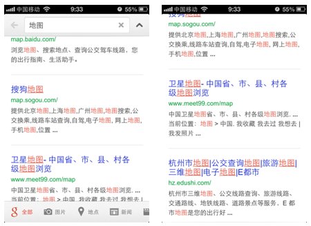 大部分的使用用户还是感受到屏幕有点小。设计的时候就需要考虑到最大化内容,充分利用屏幕。现在就有很多应用,将导航栏与工具栏在默认的时候显示,向下浏览的过程中收起,往回浏览的时候显示出来。如google搜索: