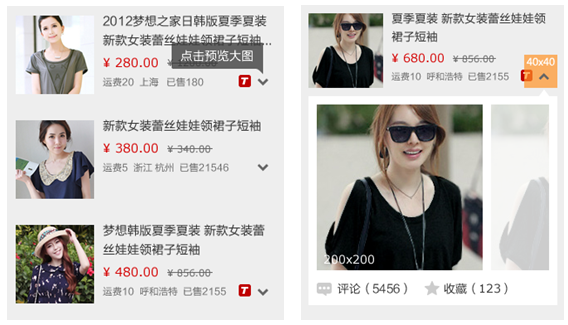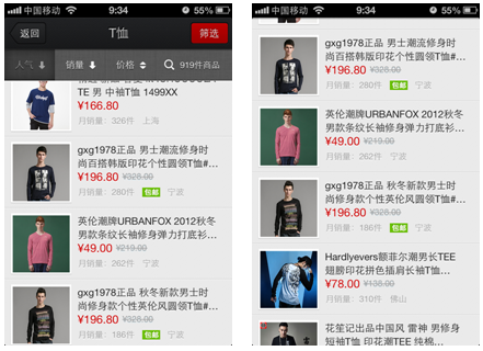 我们在进行聚划算H5产品设计的时候,针对搜索结果页的宝贝展示,最终采用了右边的方式。这里不仅仅是看的宝贝数量的多少和图的质量问题,最重要好包括流量的影响力。