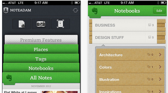 所以在考虑整个任务流程的时候,就应该用更少的路径,满足了用户操作,达到产品的连续性和效率的提升。最新版的evernote,就利用了架构扁平化的原则,如下图,在导航栏的上方放了多卡片的入口。这样的设计让用户只需1-2步就到达全部笔记、分类笔记、标签、地点等内容。用户可以很直观、方便地在各个内容间切换:单击或拖拽卡片顶部,版块内容就会放大展现,且能预览到相应的模块。这些设计都极大的提高了此应用的使用效率。