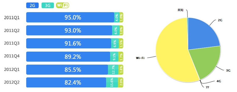 30M,10元 80M,20元 200M,30元300M,50元 500M,100元 2G。其中5元和10元,20元是大部分普通用户的选择,超过包月限额1M=10.24元。官方宣称2G的网络速度在30K/S。2G网络仍为移动互联网的主流接入方式,但占比持续下降。Andriod和ios移动产品倾向于选择高速网络接入,超过73%的用户选择3G或wifi。