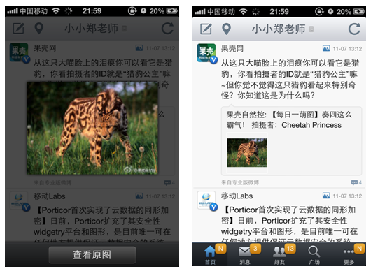 还有一个特别为用户考虑流量的产品是微博客户端。你刷的不是微博,你刷的是流量。无论新浪还是腾讯微博客户端,对图片都做了分阶段处理,小图预览,点击查看大图,再点击查看原图。点击步骤多了,但相对于省流量,相信用户更愿意接受这样的方式。