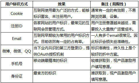 以上列举了互联网主要的用户标识方法,获取方式由易到难。视企业的用户粘性,可以获取的标识信息有所差异。