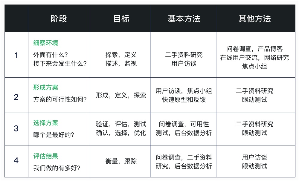 调研的第一步,也是最重要的一步,就是明确调研目标,并根据目标选择正确的调研方法。在这个过程中,我们需要对调研需求进行分析,明确产品目前所处的阶段,调研希望解决的问题及具体内容,同时初步确定调研将会采用的方法。