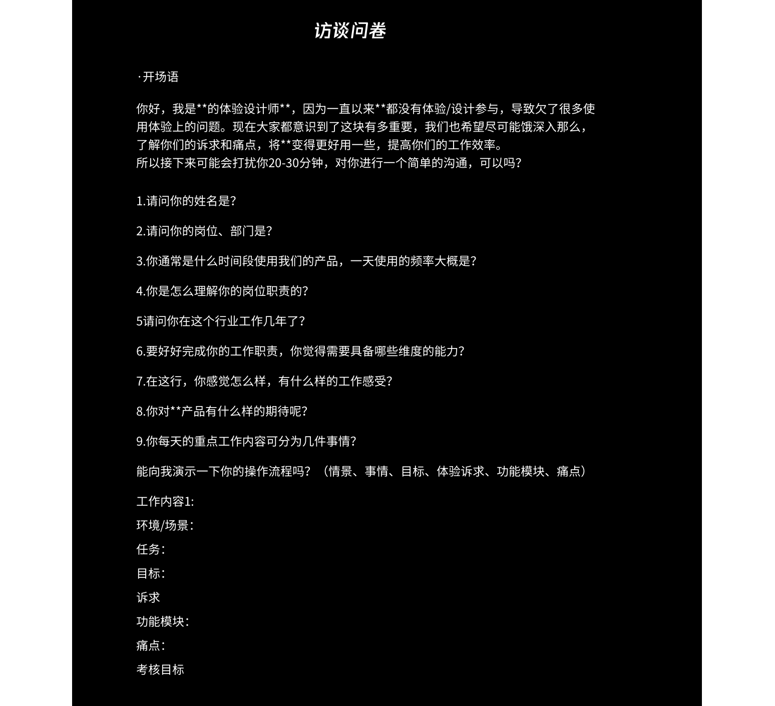 在构建用户画像的step 1中,我们已经对业务和要访谈的用户角色有了一定的了解。只需在访谈时间的4-7天前,根据确定的画像维度来设计访谈大纲。