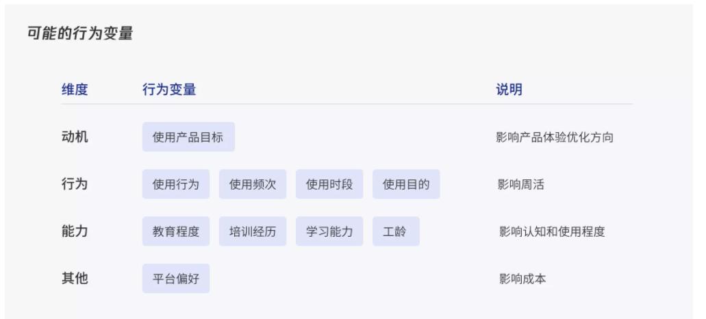 再将不同的角色间同类行为模式归纳(合并同类项),进行行为描述。此处需注意以行为变量为依据进行用户对应时,不必追求绝对的精准,只要相对能映射清楚即可。