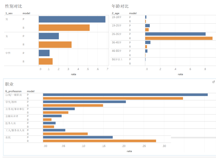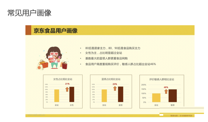 比较常见的画像是我们需要建立平台客户群体化认知时,我们需要借助可视化的标签,我们看一下京东的一个食品用户画像。对于食品这个业务场景,平台上购买的用户他们是长成什么样的?比如性别比例,蓝领与白领占比,评价敏感的人的占比等,通过「拉平垂类」偏好用户画像与「全站」的「对比」,来寻找「差异点」和「优化点」。