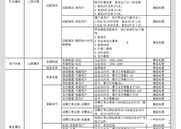 网上找了一个金融领域的例子,比如根据「活跃」情况,可以区分活跃用户和流失用户,再根据时间窗口维度可以拆为48小时活跃和不活跃用户。简单的统计就可以为用户贴上各类的标签,比如过去12个月内累计订单超过20次为界限,可以划分为「高低频」用户等。不过多展开,可以自行阅读上图。