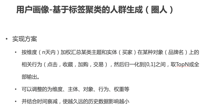 这里顺便讲一下商品画像的作用,商品画像的前台作用更多是在流量分发上与用户画像的match,关联后的一些推荐、精准推送等。比如用户标签为a类目的价格段偏好,然后商品画像也有价格段的标签,比如说用户偏好的是30-50人民币的连衣裙,然后这个商品是连衣裙并且正好是在30-50人民币的,所以可能相对其它价格段的商品而言,在这一维上更合理;接着再结合其它维度的商品和用户标签的「match」就可以构建更多的匹配维度。