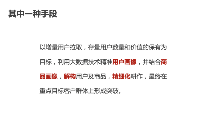 那其中的一个手段就是以增量用户拉取,存量用户数量和价值的保有为目标,利用大数据技术精准「用户画像」,并结合「商品画像」,「解构」用户及商品,「精细化」耕作,最终在重点目标客户群体上形成突破。比如电商猜你喜欢中的个性化推荐技术,万能的淘宝上有海量的商品几乎可以满足每个人的采购商品需求,但是如何让一个用户可以精准快速地找到是大问题,「个性化」是其根本,「用户画像和塑造」则是个性化的根本,希望可以让用户感受到产品「为ta而造的满足感」。