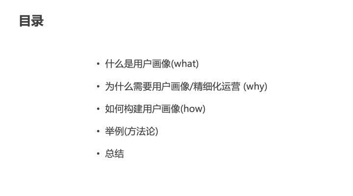 然后我们来看看目录,第一部分是说「what」,就是什么是用户画像;第二部分是说「why」,为什么我们需要用户画像以及精细化运营;然后第三部分是「how」,我们如何构建商品和用户画像;第四部分是「举例」,是一些方法论的介绍;最后,我们做一个整体的「总结」。