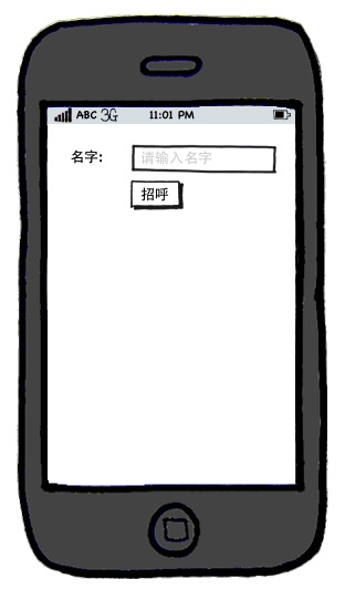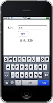 写一个iPhone应用程序,要求可以输入名字,点击按钮后,会显示一段文字向输入的名字打招呼,例如输入“宝玉”,显示“你好,宝玉!”
