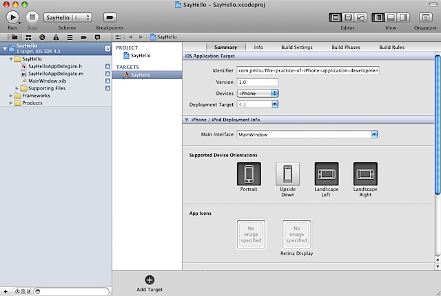 在iPhone应用程序中,视图控制器(UIViewController)起着核心作用。顾名思义,视图控制器负责管理控制视图。在iPhone上,它们也帮助进行导航和内存管理。选中Xcode项目管理器里的项目(即SayHello项目,位于Groups
