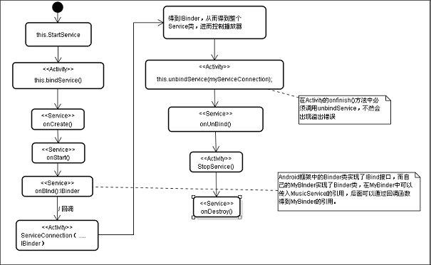 前两节中可以看到Activity和Service,context.startService对应着Service中的onStart()方法,context.onBindService对应的是Service中的onBind()方法。当我们继想绑定一个Service又想在 Activity停止时,Service不会停止,我们可以先StartService,然后再BindService()。这时候的流程图如下所示: