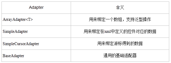 Android中提供了很多的Adapter,表4-5列出了常用的几个。