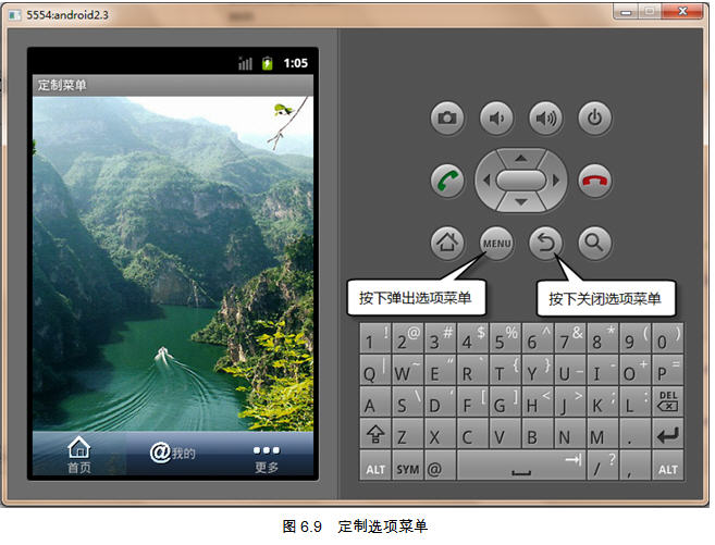 通过6.1.1节介绍的选项菜单可以知道。通过按手机的“Menu”键(是手机上的硬按键,不同手机“Menu”键所在的位置会不同),可以弹出选项菜单,再按“Back”键,选项菜单会关闭。那么要想模拟选项菜单的弹出和关闭效果,只需要监听这两个键的按下事件即可。并且在“Menu”键按下时使用PopupWindow弹出一个窗口作为模拟的选项菜单。下面先来看看如图6.9所示的模拟选项菜单的效果