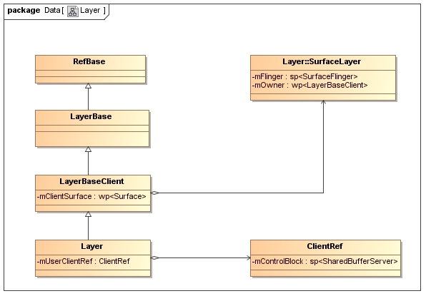 Layer类继承了LayerBaseClient类;LayerBaseClient类继承了LayerBase类;LayerBase类继续了RefBase类。从这些继承关系就可以看出,我们可以通过Android系统的智能指针来引用Layer对象,从而可以自动地维护它们的生命周期。