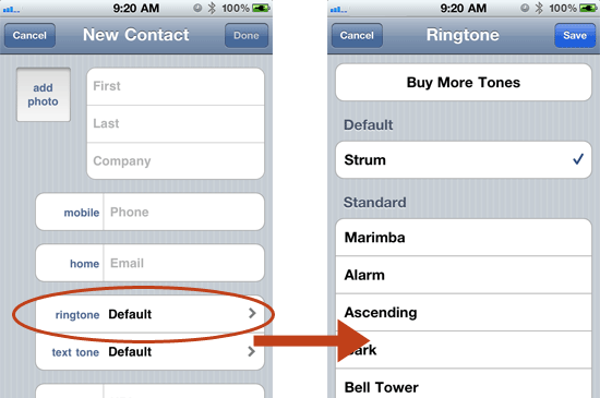 iPhone里,你经常可以在“创建”视图里碰到这种使用场景。例如,新联系人界面,选择铃声(ringtone)时,你会进入新的Ringtones视图,其中展示了可选择的铃声列表。