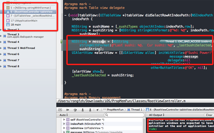 看了下crash的这个语句,sushiString应该是没问题的,它是从stringWithFormat初始化出来的。那就是_lastSushiSelected的问题。