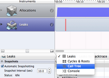 先在工具栏按下红色的圆形按钮,把工具监视内存的活动停下来。选择Leak,然后点中间十字交叉那,选择Call