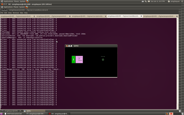 架构相关的模块移植好之后,剩下的都是一些很零散的问题,例如android跟kernel的磨合,驱动的debug,android自身的各种服务和它们之间的机制问题等!只能一个一个地去修bug了!目前android系统已基本上运行起来!