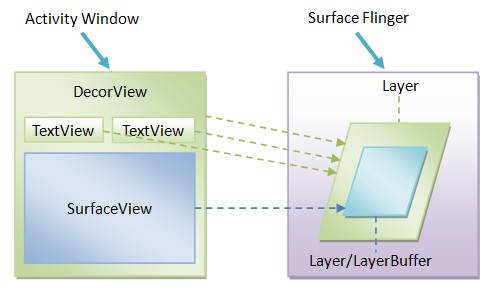 在图1中,Activity窗口的顶层视图DecorView及其两个TextView控件的UI都是绘制在SurfaceFlinger服务中的同一个Layer上面的,而SurfaceView的UI是绘制在SurfaceFlinger服务中的另外一个Layer或者LayerBuffer上的。