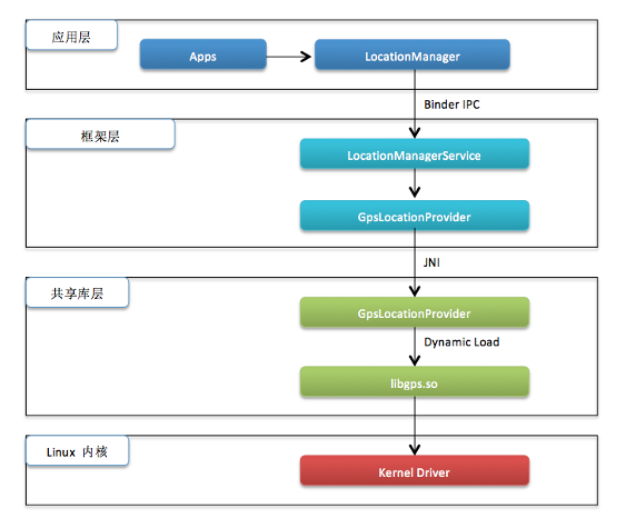 - 最上面是应用层,即 android.location 包中包含的内容,是以 Java 语言提供的
