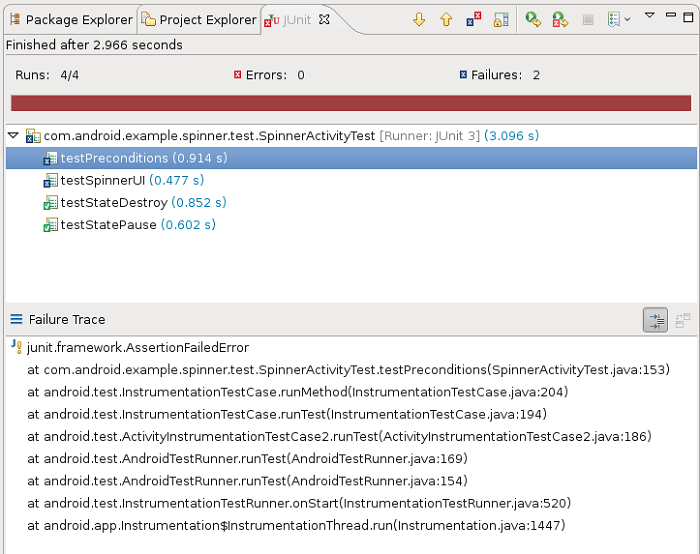 测试结果显示在JUnit视图中,它被分为上面的一个描述概要的窗格和下面的一个跟踪堆栈信息的窗格。